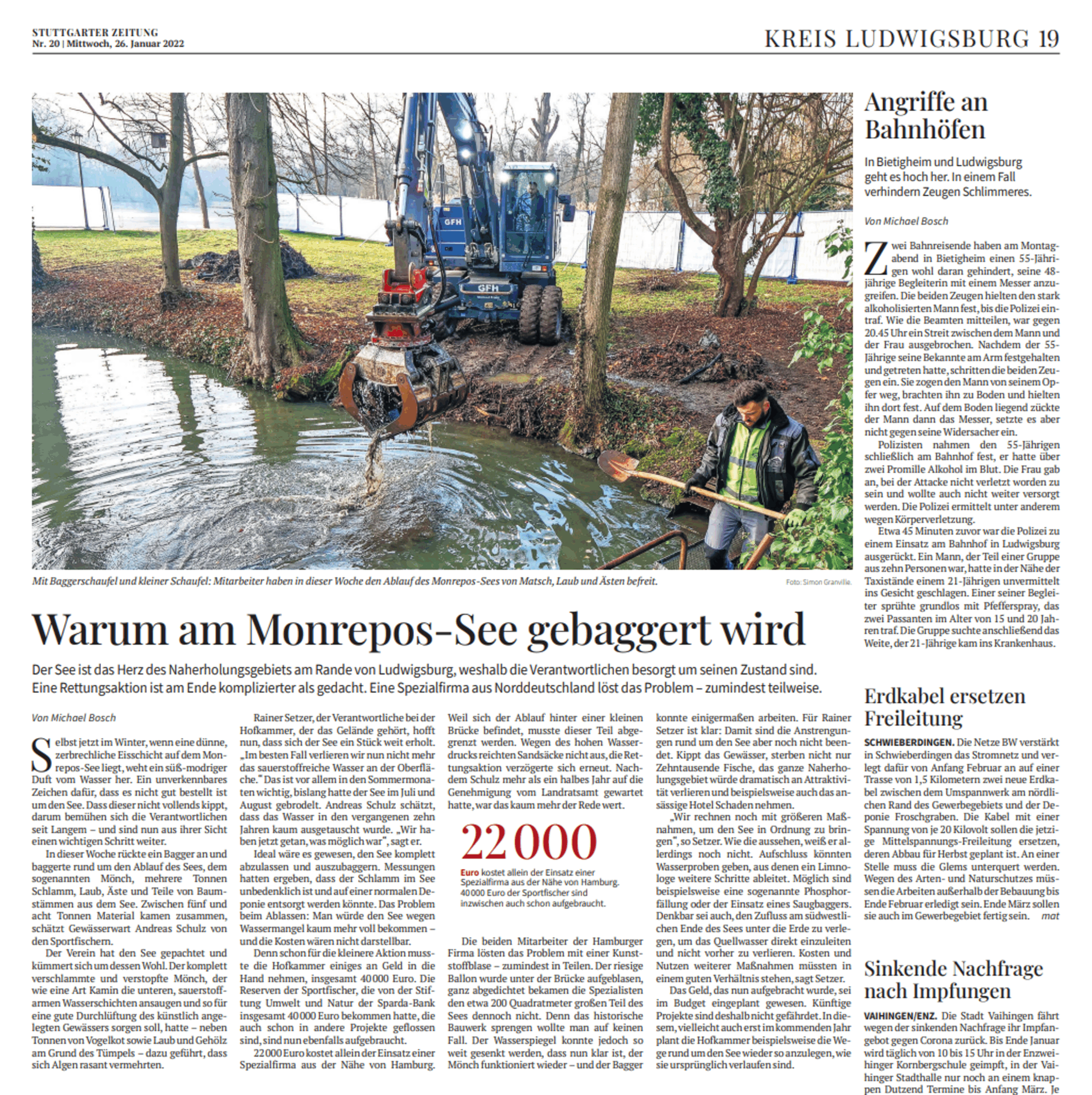 Bericht der Stuttgarter Zeitung über Baggerarbeiten am Monrepos See