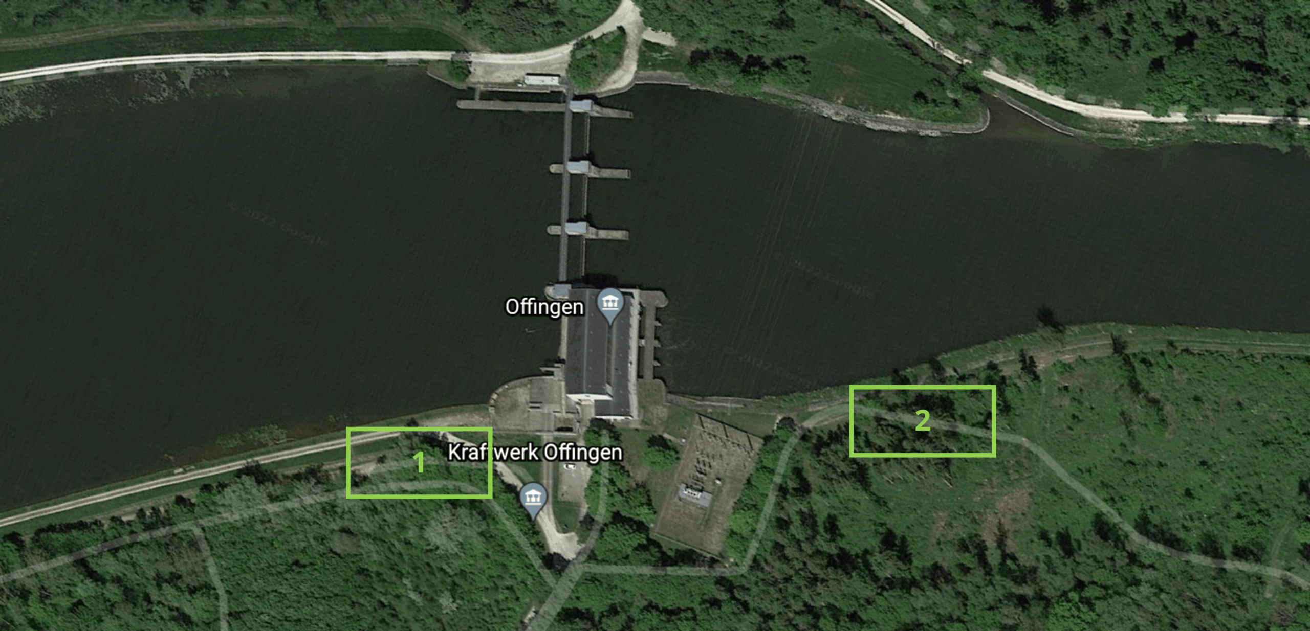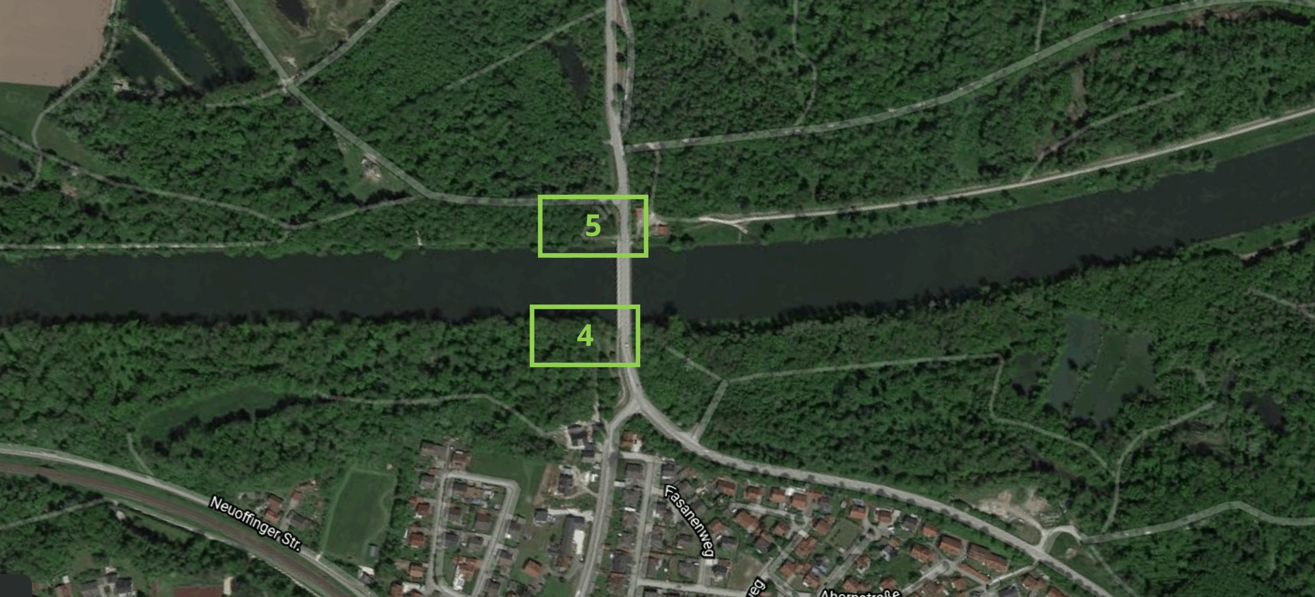 Parkmöglichkeiten (1+2) sind an der Donau am Kraftwerk auf Offinger Seite (oberhalb und unterhalb), an der Offinger Brücke (4 -Gemeindeseite Stichweg Richtung Wasser), an der Eisenbahnbrücke (3) auf Offinger Seite (Stichweg ca. 150m vor der Bahnschranke rechts folgend) und für Spinnangler (Wanderangler) an der Parkbucht (5) beim Radlertreff. Die Zufahrts- bzw. Betriebswege dürfen nicht blockiert oder zugeparkt werden.