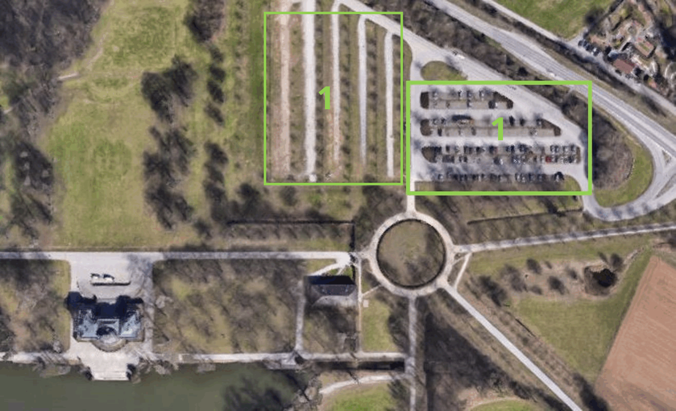 Rund um den Monrepos See stehen drei Parkmöglichkeiten zur Verfügung. Der Hauptparkplatz(1), eine kleine Parkmöglichkeit im hinteren Bereich des Sees direkt an der B 27(2). Sollte es um diese Parkplätze eng bestellt sein, so gibt es ebenfalls die Möglichkeit die hinteren Parkplätze des Golfplatzes (3) zu nutzen.